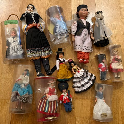 Vintage dukker med myk kropp og vinylhode/lemmer. Trolig fra 1980-tallet. Uttrykksfulle ansikt.