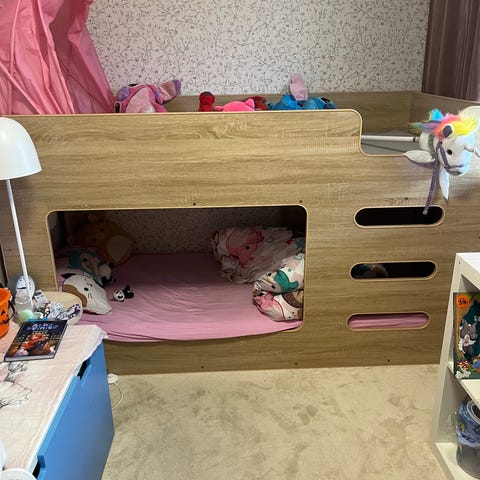 Ser ikke noe skader på sengen. Seng skrudd ned da vi har ei som var veldig klar for ny farge på rommet sitt.