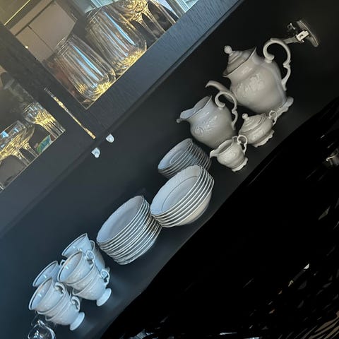 Innhold (som på bildene): flere kopper + ulike skåler/fat og serveringsdeler (med lokk).
