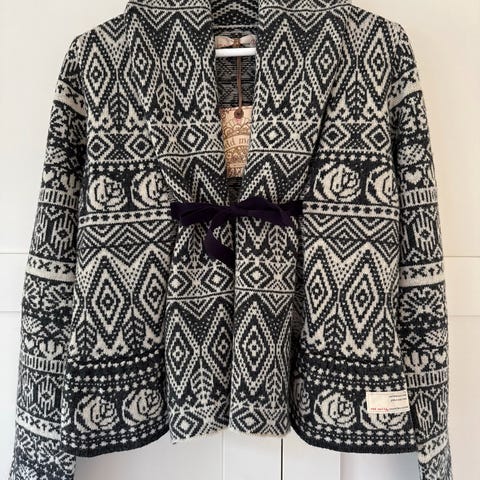Odd Molly cardigan i ull, flerfarget, størrelse L for damer. Cardiganen har et mønstret design med detaljer i flere farger og er laget av 80 lammeull og 20% nylon. Selges da den ikke blir brukt.