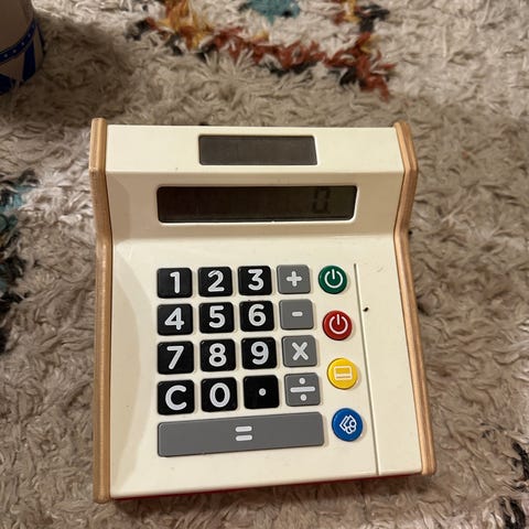 Lekekasse med kalkulatorfunksjon og mynter