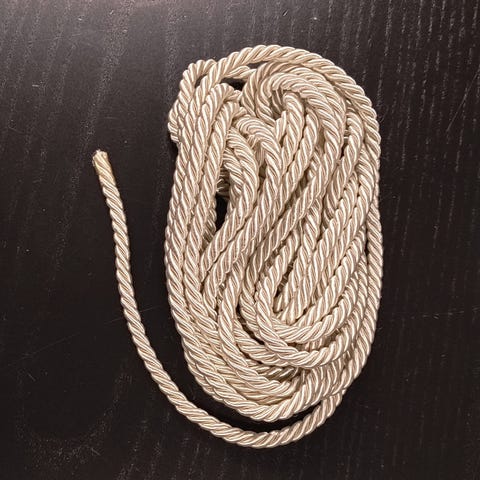 Ubrukt, glansfull møbelsnor 5 mm tykt, 5 meter hel lengde. 2 tråder (cordel) surret med tynn glansfullt floss. Mellomgrå farge, mot stålgrå
