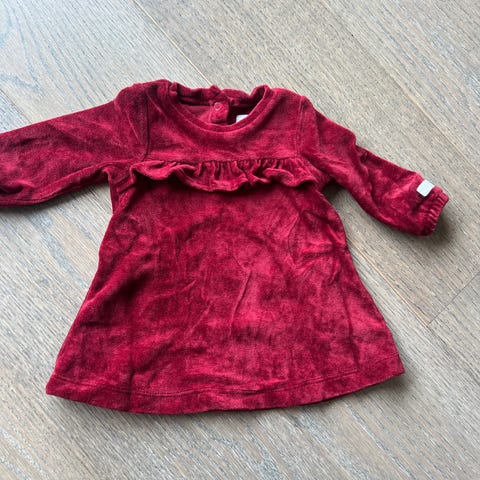 Newbie rød kjole i bomull for jente, størrelse 104 (3-4 år). Kjolen har lange ermer og knappelukking ved halsen.
