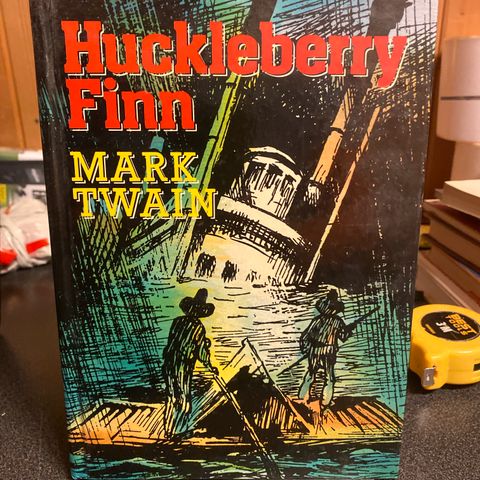 Mark Twain Huckleberry Finn bok, norsk utgave fra 1973. Boken inneholder originale illustrasjoner og er utgitt av Gyldendal Norsk Forlag A/S. ISBN 82-525-1540-0. Boken er en norsk oversettelse av 'The Adventures of Huckleberry Finn' og inneholder tekst på norsk.