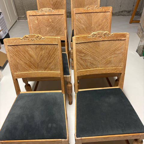 Selges 6 stk Abby spisestuestoler kjøpt på Stilbo i 2018. Noe bruksmerker, men kun kosmetisk. Kan enkelt tørkes av. Veldig behagelige stoler. Fargen er mørkeblå.