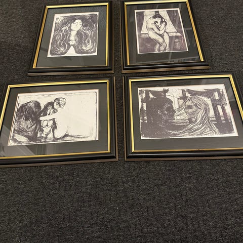 4 stk Edvard Munch bilder selges 700 kr for alle samlet. Hele men en del skrap i rammer. ( prislappen på glasset fjernes før salg ). størrelse 39 cm x 32 cm