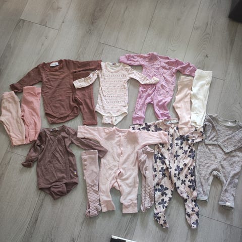 Veldig lite brukt, de fleste ser ut som ny, forskjellige ull med blanding av silke/bambus/bomull klær for jente i str 62.