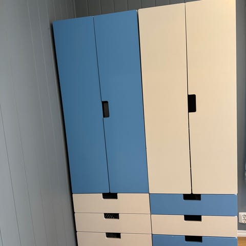 Barna har dessverre lekt gjemsel i skapet nå som det har stått tomt, så bunnen i skapet har fått en liten smell i et av de bakre hjørnene. Tror det vil påvirke bruken i liten grad, da skapet hovedsakelig er til å henge klær i, men hjøret er nok noe svekket. Man kan også justere hvor stangen skal stå så hyllen eventuelt er over stangen i stedet for under som på bildet.