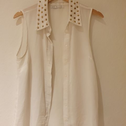 Hvit bluse fra ONLY i størrelse 36. Toppen har lange ermer med knapp ved mansjett og dekorativ detalj med perler rundt halsen. Lukkes også med knapp i halsen, men jeg fikk ikke lukket den da toppen er litt stram til meg over skuldrene. Har også klippet av vaskelappen da den syntes gjennom stoffet.