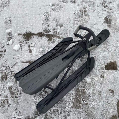 Stiga Snowracer barnekjelke med ratt og brems. Den har en solid konstruksjon for bruk på snø.