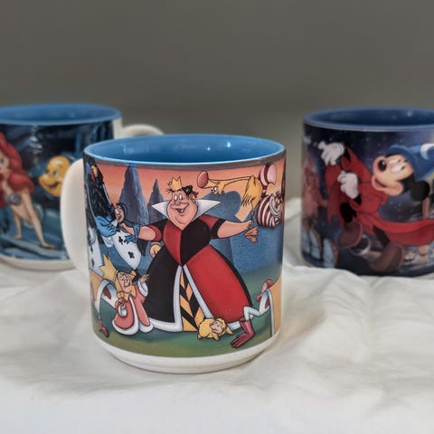 Selger en liten samling Disney Store–eksklusive keramiske krus med matchende coasters, med Mickey Mouse og bytema.