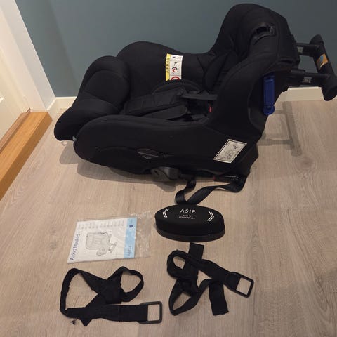 Bakovervendt bilstol, som festes med setebeltene