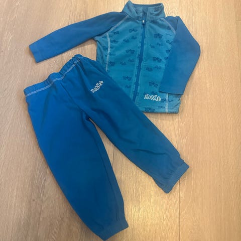 Skogstad barneklær fleece sett i størrelse 98 for gutt. Sett består av jakke med glidelås og bukse, laget av fleece materiale i blå farge.