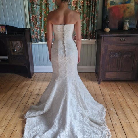 Gorgeous soft Chantilly lace, fit and flare, gown. Per perfect for a destination wedding as well as a second gown. Super light, soft and delicate. You can dress it up or dress it down making it your very own!