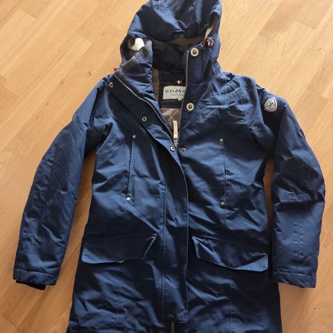 Selger en pent brukt, vann- og vindtett parkas med avslappet og feminin fasong. Fast hette, høy krage og snøring i midjen gjør den både varm og flatterende. Store lommer gir praktisk oppbevaring, og jakken har en elegant avrundet bakkant.