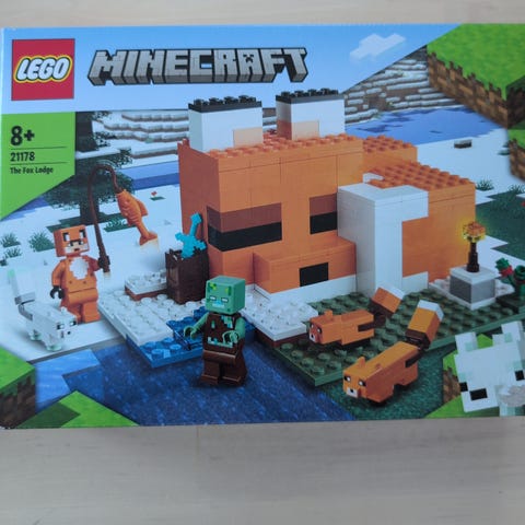 LEGO Minecraft Lego-sett med forskjellige figurer og elementer fra Minecraft-verdenen. Settet inkluderer byggbare deler som representerer landskap og karakterer fra spillet. Eneste som mangler er kompasset Steve holder.