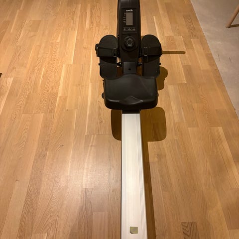 Exerfit Romaskin treningsapparat i svart farge. Utstyrt med digital skjerm for måling av treningsdata og justerbar motstand. Pedaler med stropper for sikker fotplassering og sete med skinner for bevegelse under trening. Egnet for innendørs kondisjonstrening.