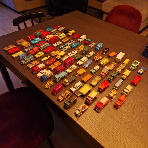 Lesney Matchbox lot med fire ulike modellbiler og en liten gul garasje som tilbehør. Bilene varierer i farge og design, med detaljer i metall og plast. Passer til samling eller dekorasjon.