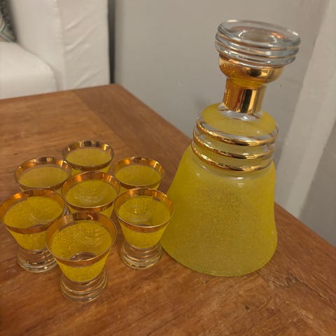 Selger et vakkert sett med drikkeglass i den populære Mid-Century Modern (MCM) stilen! Disse sjarmerende glassene er kjent som "pulverglass" eller "sukkerglass" på grunn av sin unike, frostede tekstur nær bunnen.