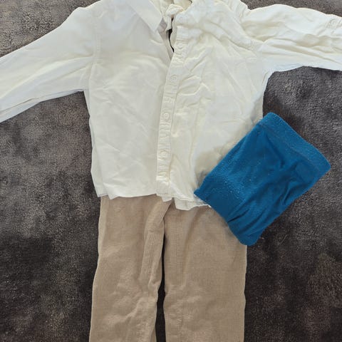Fire skjorter selges samlet. En helt ubrukt skjorte fra Hust&Claire i str 116, en blå skjorte fra H&M i str 116 og to t-skjorter med knapper fra Cubus i str 110-116. De tre siste pent brukt.