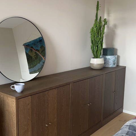 Er benyttet som vegghengt tvbenk, kjøpt på Bolia.