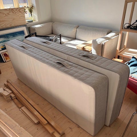 IKEA Valevåg madrass med trekk i beige og grått mønster. Madrassen har en polstret overflate med synlig glidelås for avtakbart trekk. Passer til enkeltseng. kjøpt i mai 2023.