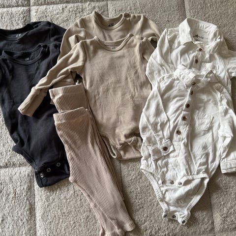 Pakken inneholder dobbelt opp av bodyer, bukser, gensere, pyjamaser. Noe ull. Plaggene er delvis i ulike farger/mønstre for lettere "å se forskjell".