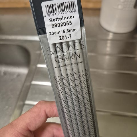 Selger strikkepinner: 6mm, 6mm, 5mm, 3,5mm, 3mm, 2,5mm.
