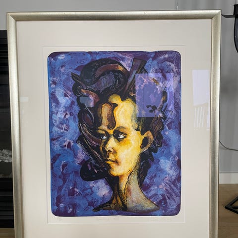 Jeg ble enig med rammemakeren om å ramme det inn både med en sterk rødfarge og en mattere blåfarge for å fremheve dualiteten mellom ansiktene/personlighetene i det ekspresjonistiske bildet. Resultatet ble utrolig flott, syns jeg!