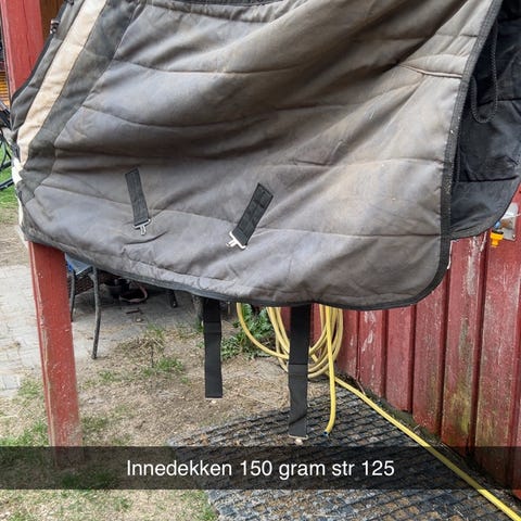1. Tykt og godt stalldekken (kan brukes ute også). Merke Rhino (?). Str 135. Med hel hals. Litt skittent, men pent brukt. Litt rust på spennene, men det kan sikkert fjernes. Fungerer helt fint, og er helt og fint.
