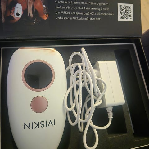 Nori Skin IPL hårfjerningsapparat med tilhørende lader og bruksanvisning. Enheten er svart med detaljer i gullfarge.