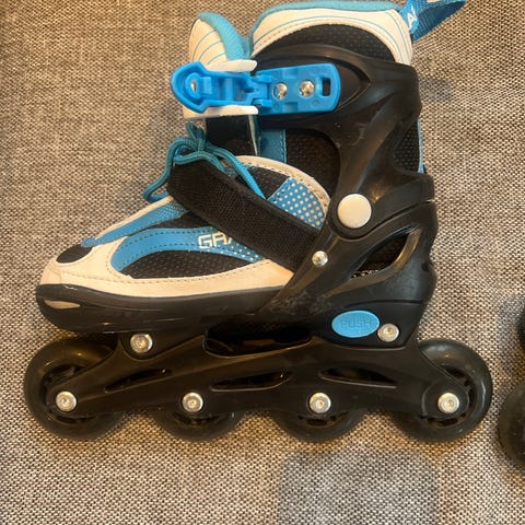rulleskøyter for barn i størrelse 29/32. Skøytene har justerbar størrelse og inkluderer både hjul for rulleskøyting og utskiftbare isblad for skøyting på is. Fargene er hovedsakelig grå, svart og røde detaljer. Egnet for barn som ønsker å bruke samme skøyter til både rulleskøyter og is-skøyter.