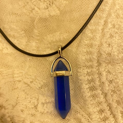 Jeg er ingen ekspert på steiner så jeg vet ikke hvilken type dette er.Lengden på steinen er 3 cm og lengden på kjedet er 45 cm.Den har ingen skader.Dette kan hentes hos meg i Oslo eller jeg kan sende det og kjøper betaler porto.