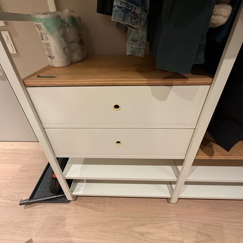 To flyttbare hyller og garderobestang. Plass til både brettede klær og klær som henges opp. Pleksiglass i de to runde sirklene som er håndtak.