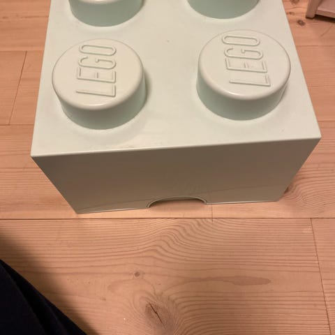 LEGO oppbevaringsboks for barn, formet som en stor LEGO-kloss. Boksen er mintfarget og har lokk med LEGO-logo. Egnet for oppbevaring av leker eller andre gjenstander. Tapet i bunnen da den er brukt til små Lego, kan lett fjernes. Selger to tilsvarende bokser og en i str mindre også.