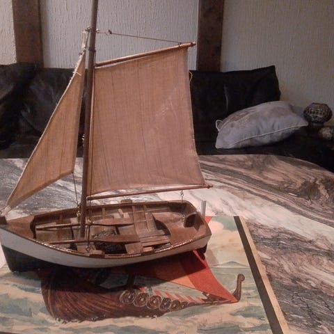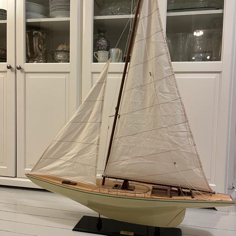 Modellseilbåt laget i tre med hvite seil. Båten har detaljer som master, tauverk og skrog i tre. Passer til dekorasjon eller som samlerobjekt.