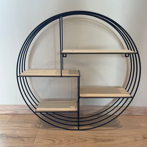 Dette er en rund vegghylle i industriell stil med fire hyller i lyst tre og en svart metallramme.
