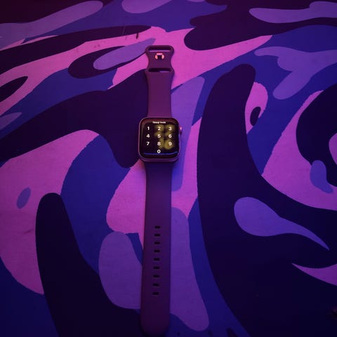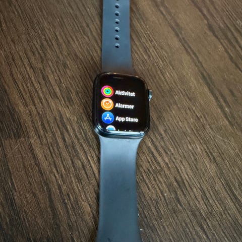 Svært lite brukt Apple Watch Series 7 smartklokke med blå silikonrem. Klokken har en stor, kant-til-kant skjerm og er designet for å spore helse- og treningsdata. Egnet for daglig bruk og trening.