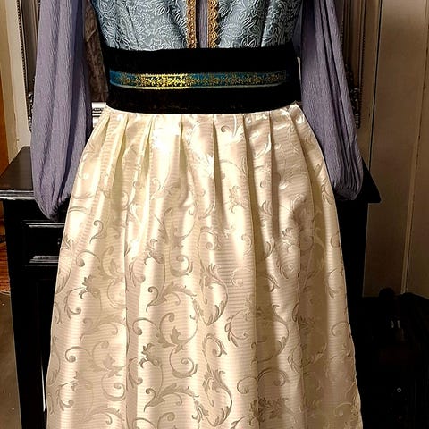 Festdrakt med forkle i str s-l. Blir sydd etter mål ved salg. Maksmål er midje 90 og byste 100 samt høyde 1.70.