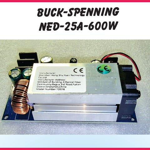 Spenning NED=BUCK konverter-ca. 200W 15A. Justering av både strøm og spenning