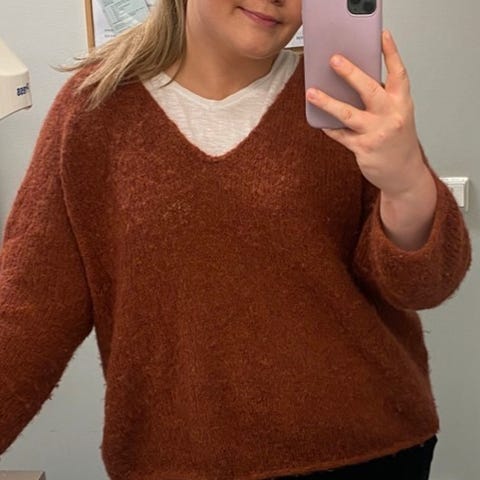 Håndstrikket genser strikket i to tråder kid silk. Brukt en gang men den var feil størrelse