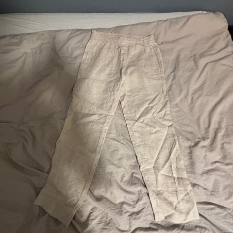 H&M bukser i beige farge, laget av lin. Størrelse XS for herre. Bukser med elastisk midje og snøring for justering.
