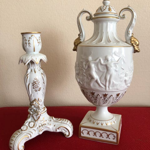 Klassisk dekorativ urne/pokal i hvitt porselen med relieffdekor og gullstaffasje.