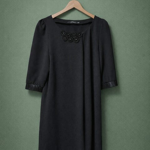 Kjolen har 3/4-lange ermer og en flatterende fasong, med markerte sømlinjer foran som gir en smal og pen silhuett.
