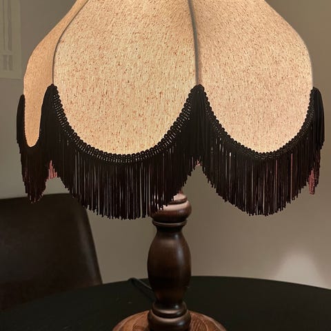 Brun vintage bordlampe med justerbart hode og høyde. Lampen fungerer og har lang ledning med bryter på.