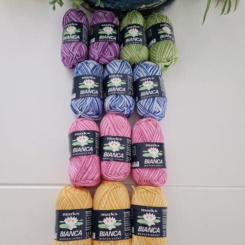 11 nøster hvit (farge 01), hvorav et nøste er strikket noen meter og rekket opp (alt garn er der), og to nøster der det er hhv. 19 og 22 gram igjen.