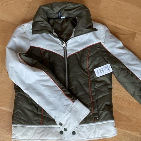 H&M jakke fra Devided i størrelse L , beige farge. Den har dobbelspent knappelukking og to sidelommer.Lite brukt ..passer opp til ca strl 44