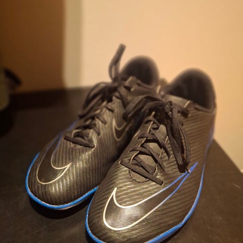 Nike fotballsko innendørs i størrelse 33, svart farge. Skoene har snøring og en såle med mønster for grep. Materialet er syntetisk, egnet for bruk innendørs. Kommet ny modell som het Vapor 16 som koster type 649, så prøver meg på 250 kroner da de er brukt 3-4 ggr før de blei for små..