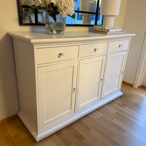 Selger en pen og solid skjenk/kommode i lys farge med dekorative nettingdører (kyllingnetting). Gir et lunt, landlig og litt vintage preg, og passer perfekt i stue, gang, kjøkken eller TV-benk.