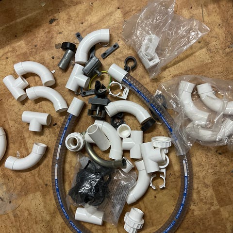 2 gjenge-stag ×1 meter, diameter 13 mm med 4 mutter og 4 skiver. 10 stk.spiker-plater 80×300 mm. 10 stk. Gaffel-anker 60×315 mm. 4 stk. Gaffel-anker 'type rett' 60×315 mm.